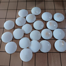 The 180 white stones are Japanese clams, with a wonderful variety in patina from age. The 180 black are glass.