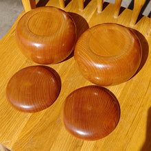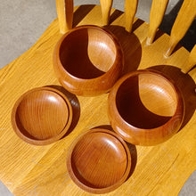 The bowls are Keyaki (Zelkova) with a pleasing orange-brown tone. They have their original finish. They fit the stones comfortably. Please see photos for measurements.
