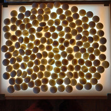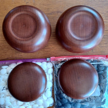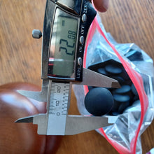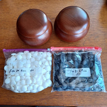 The 181 black stones are slate, and are slightly larger than the white (size 31) which is usually preferred so that they appear the same size side-by-side. They were washed with soapy water and rinsed with distilled water, but have not been buffed with mineral oil.
