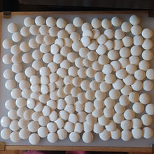 The 180 white stones are Japanese clams. They are Suwabute stones, with lines that are packed so thick that Snow does not quite do them justice. Rather, these slow-growing clams are no longer harvested due to depletion, and are graded differently than Mexican clamshell. They would be considered Blossom or Snow grade Suwabute stones, noted by only a faint presence of irregular orange colorations. They are size 22, 6.4-6.6mm thick and 22mm wide. Purchased new, a set like this costs over $400 for the stones alone (if they are in stock).
