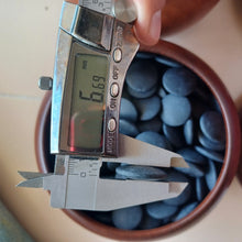The 181 black slate stones are slightly wider, 22.5mm, and it is very common for the black stones to be larger because if both colors are actually the same size then the bright white pieces will appear larger. They are roughly the same thickness, at 6.5mm. They can be buffed with mineral oil if you want a darker look.