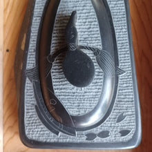 This inkstone is made from the same pure-black slate that Go Stones are made from. It is carved in a decorative manner and makes a great desk decoration and functional paperweight.