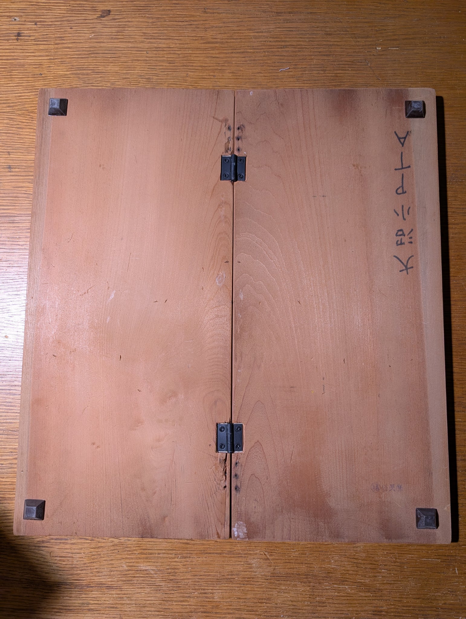 This Japanese board is 1.6cm thick. The hinges and grid were in bad shape, so both have been replaced and furniture feet were added.