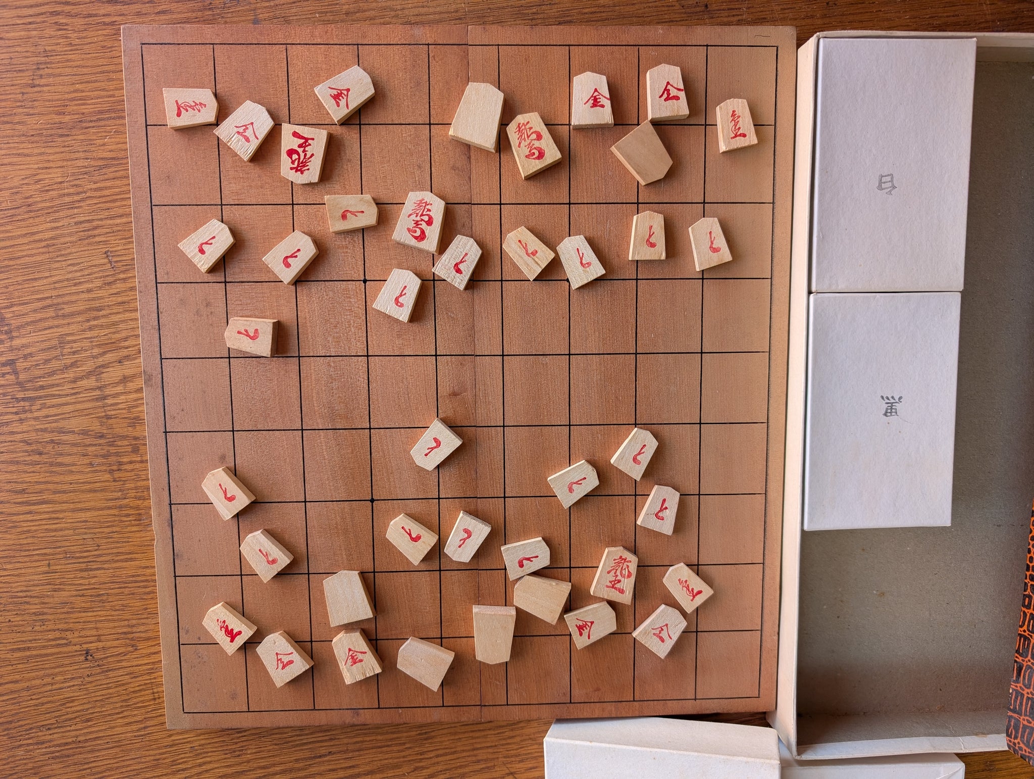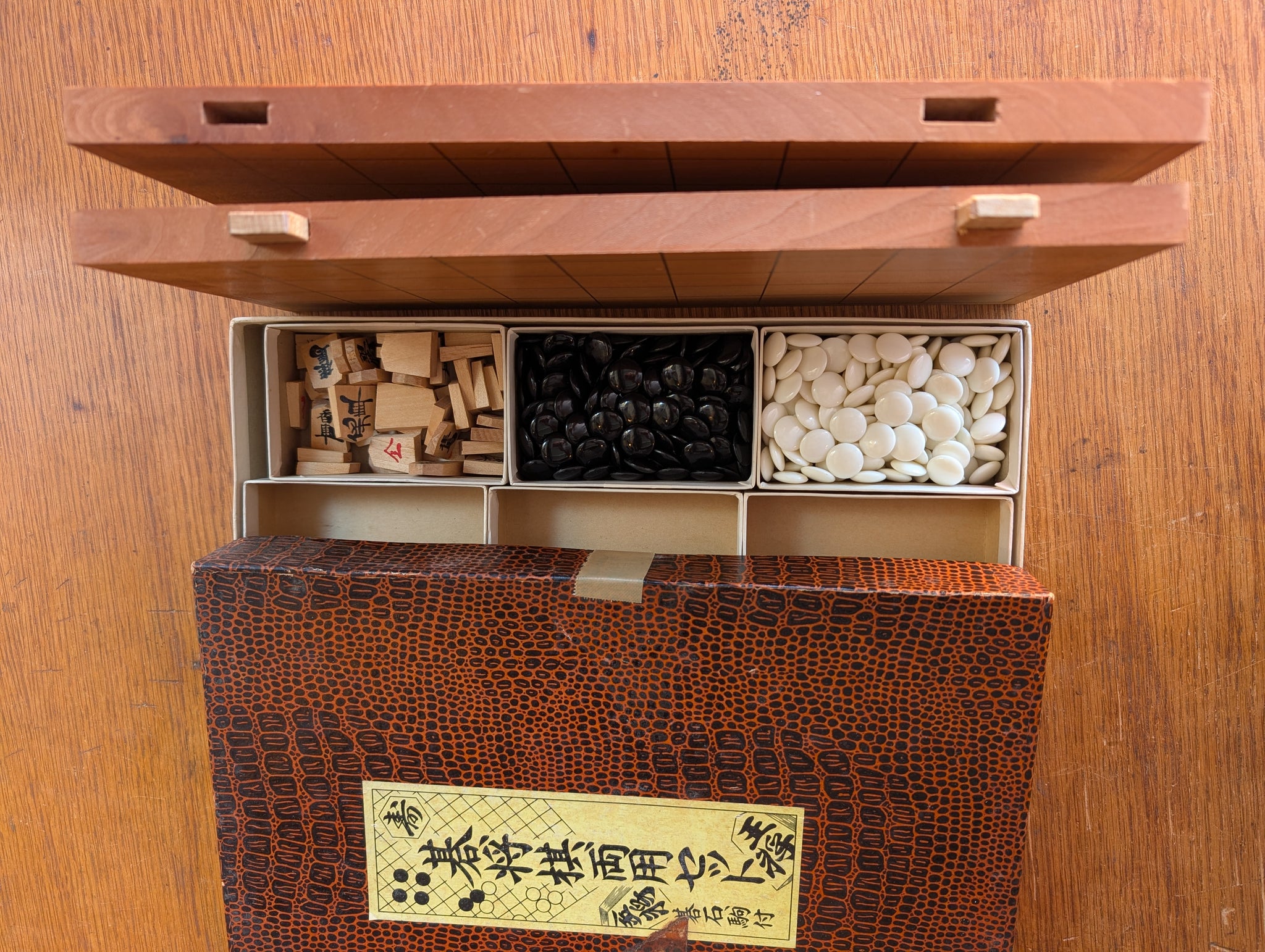 The reverse side of the board has a shogi grid. A set of Shogi pieces is included.