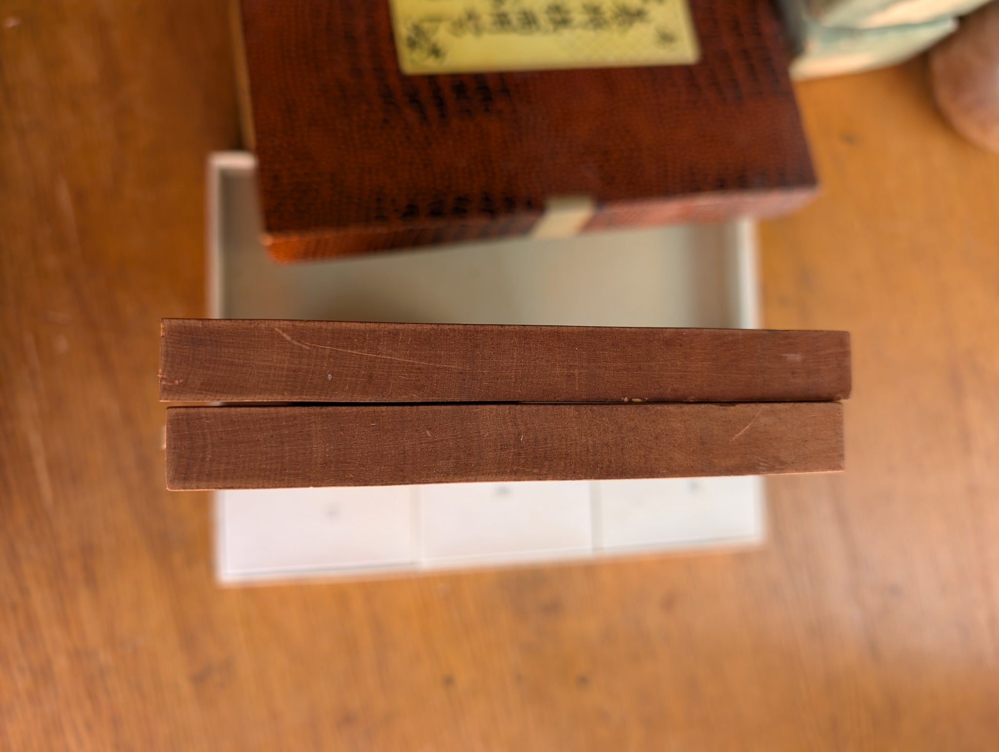 This board is an older style that is no longer produced. Tenons on one side slot into the mortises on the other, creating a compact and portable set that still feels solid and substantial. The wood was carefully selected, both sides are from Quartersawn wood. The wood is fairly dense, and the end grain looks like Katsura.