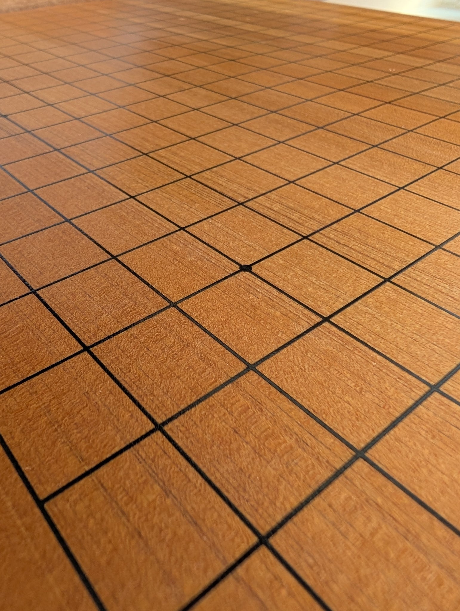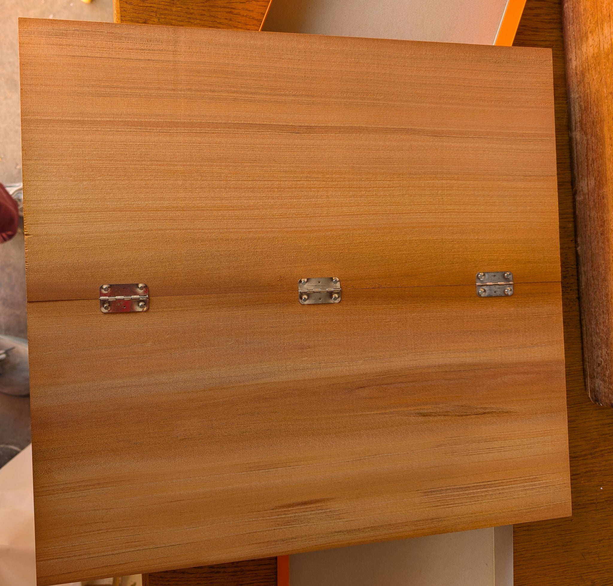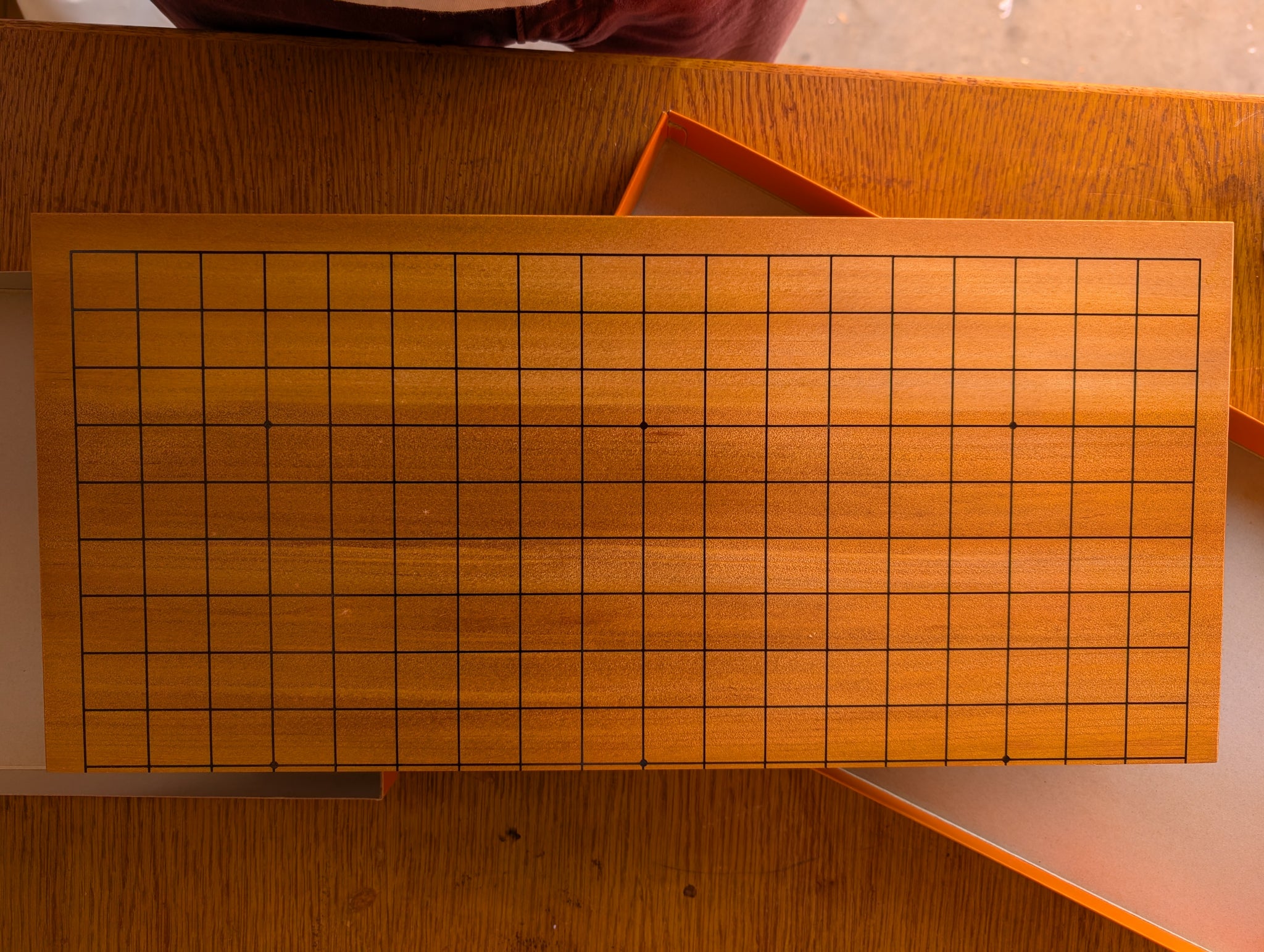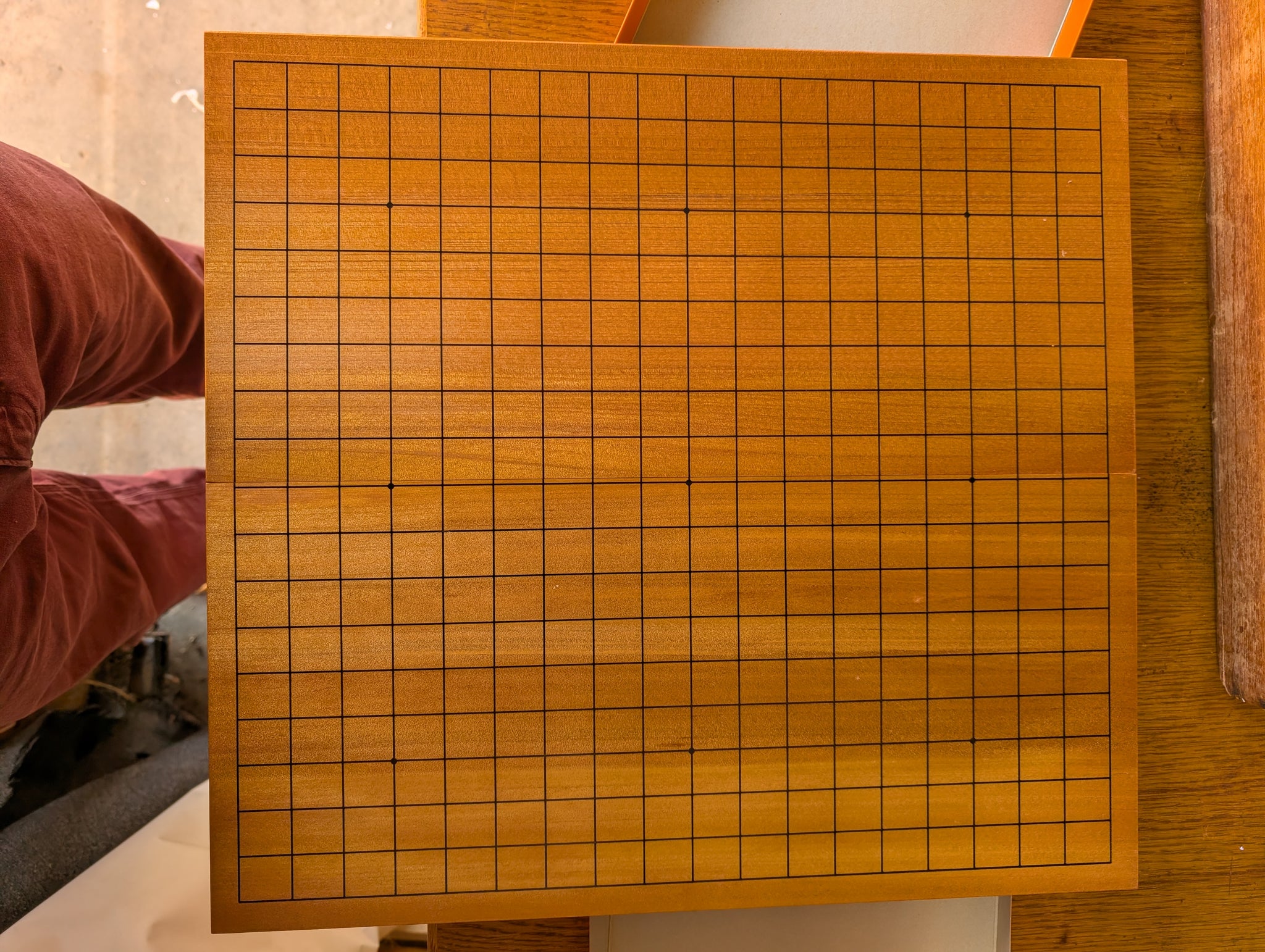 This board is an older style, as we can tell by the hinges. The wood was carefully selected, both pieces are Quartersawn. The wood is Katsura, fairly dense and dark with a soft sound when stones are played. There may be incidental marks.
