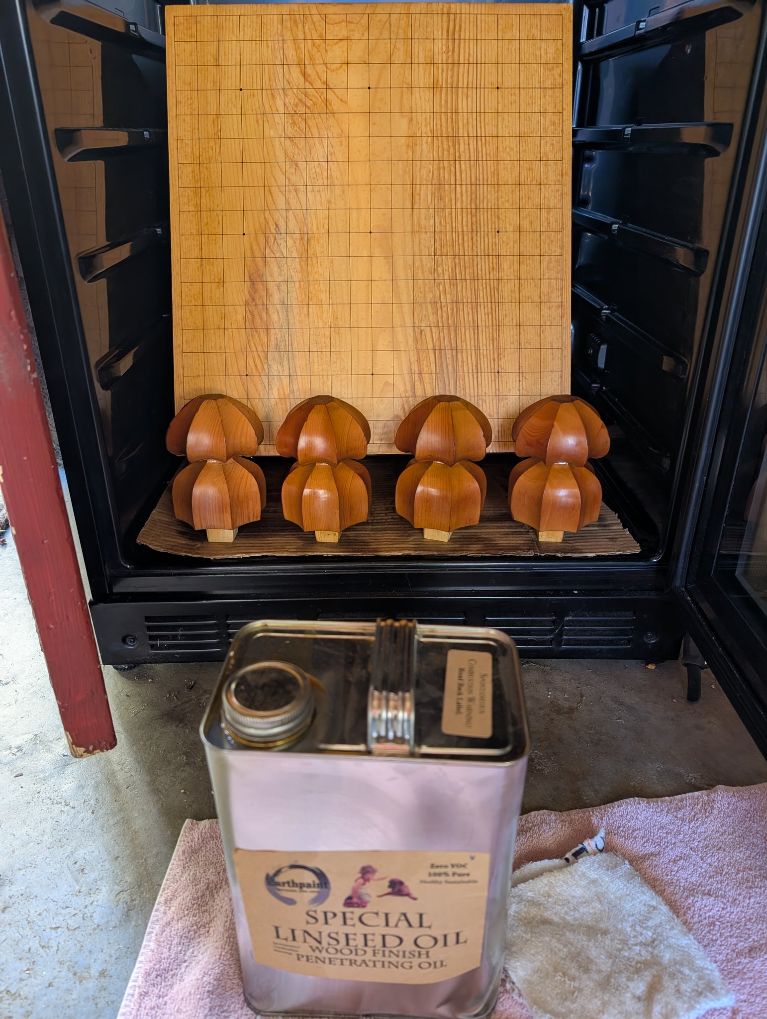 Refurbishing will be a month-long process. First, the sides and bottom were refinished to remove the old patina (thanks to KagenSound for the assistance!). Next, a coat of Special Linseed oil was applied to the board and legs, and the are currently being given 1 week to cure. During this time the board is kept in a humidor to maintain the moisture level. After that, a layer of Monkey Wax will be applied, the board was given another 2 weeks to cure before being buffed.