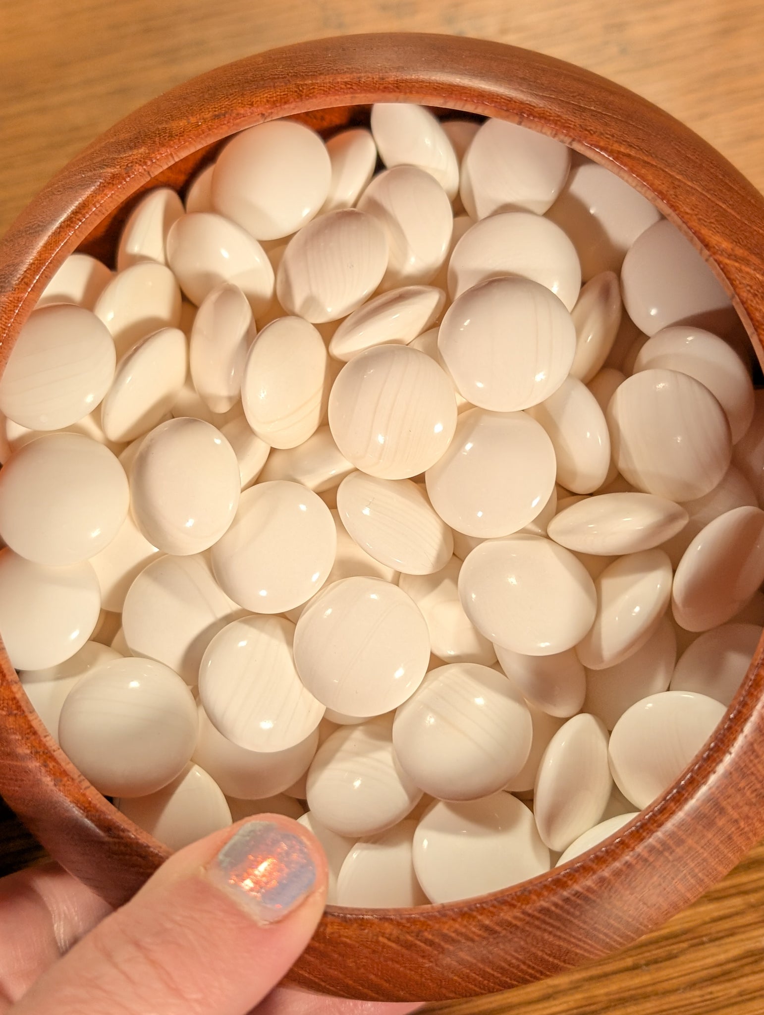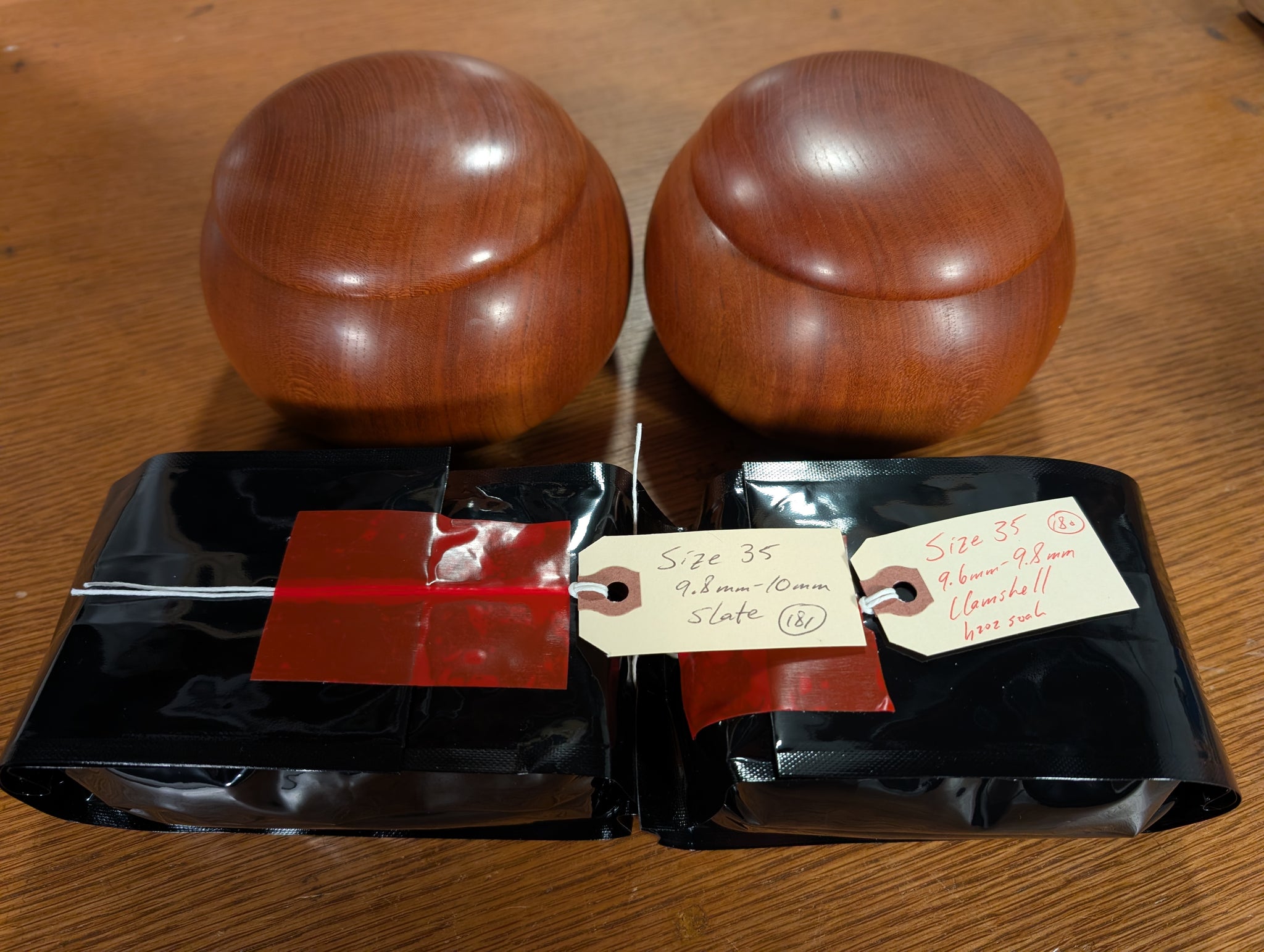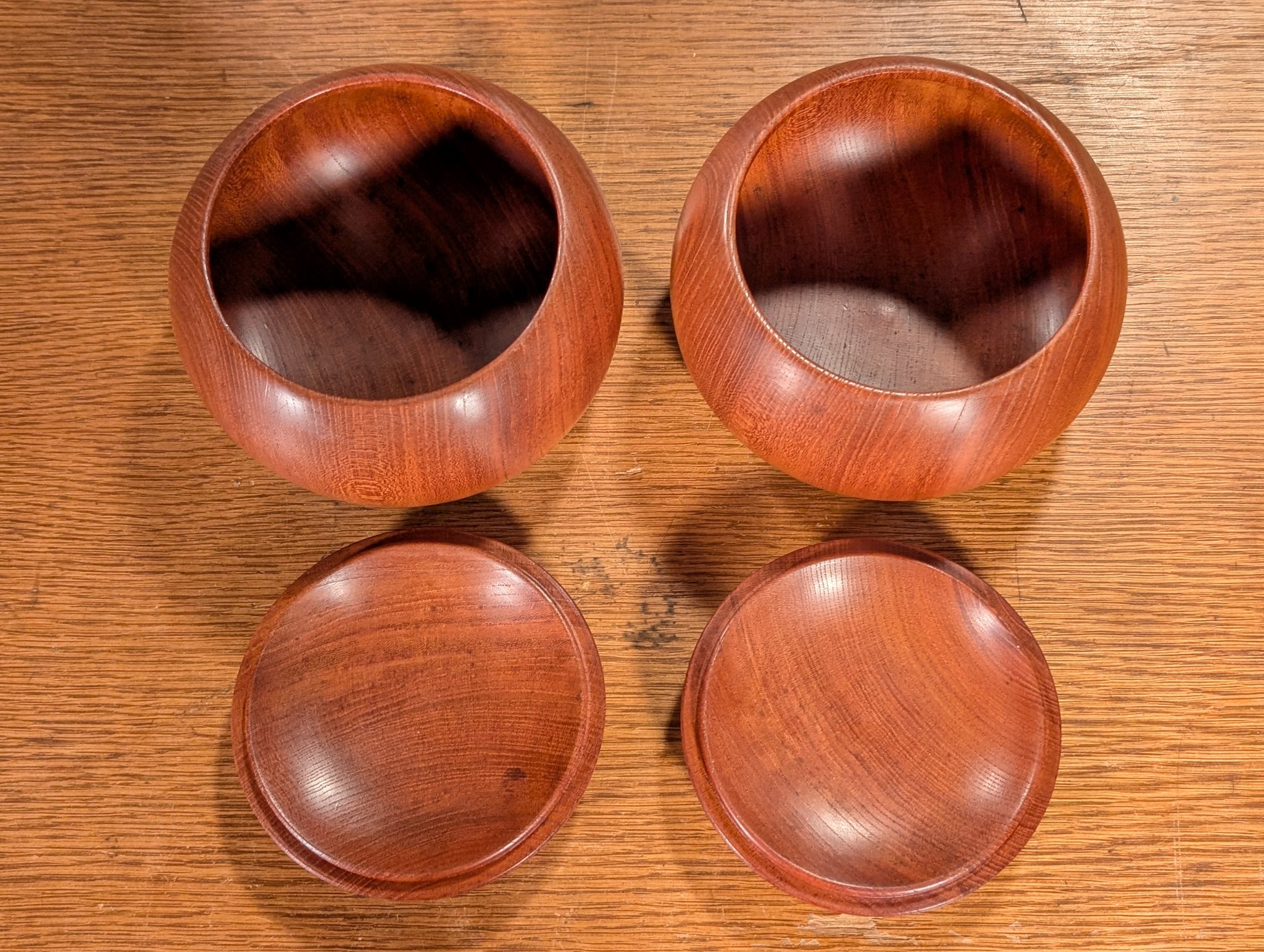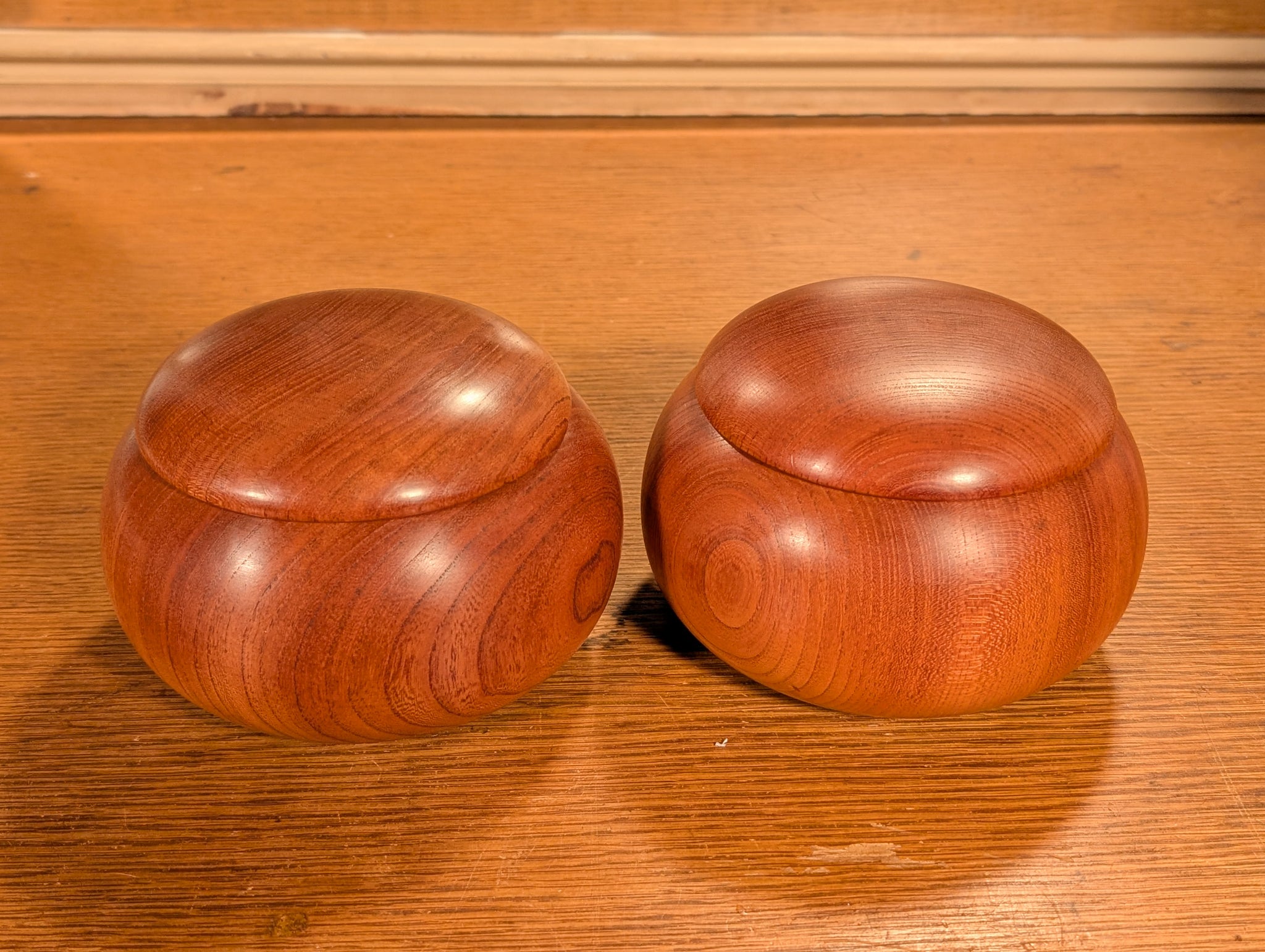 The bowls are Sakura (Cherry), and their grain catches the light very well. Cherry has a high density and good longevity, making it one of the premium woods for go bowls. At XL size, they fit the ~10mm stones comfortably. They were cleaned of their original finish and treated with Monkey Butter.