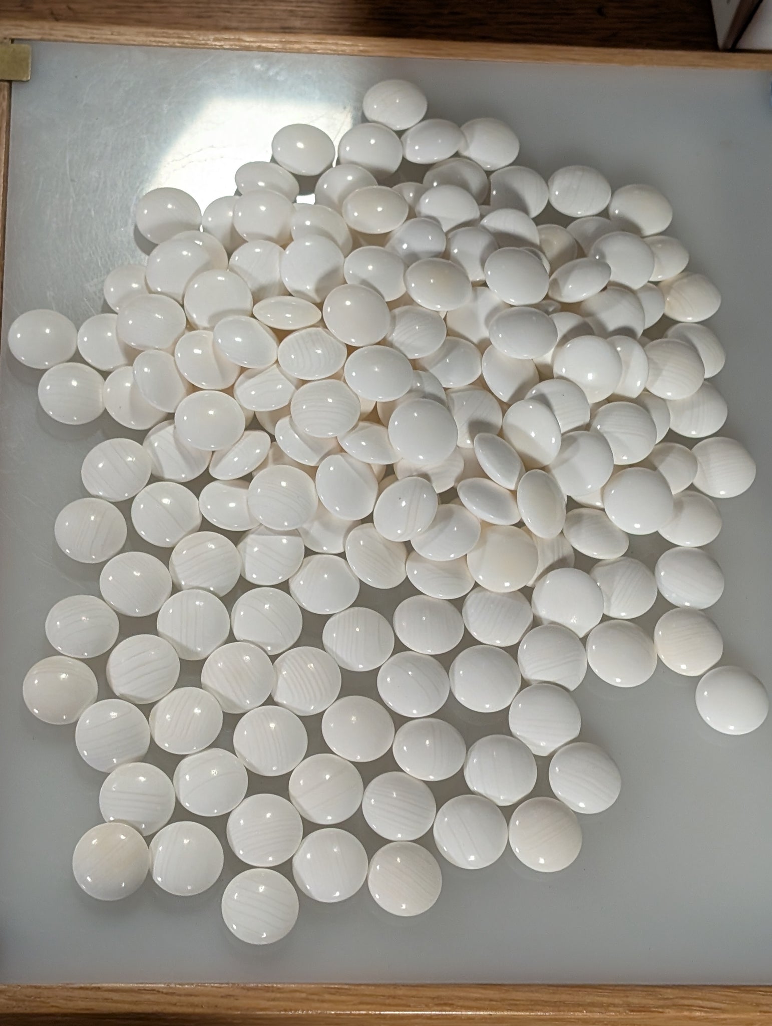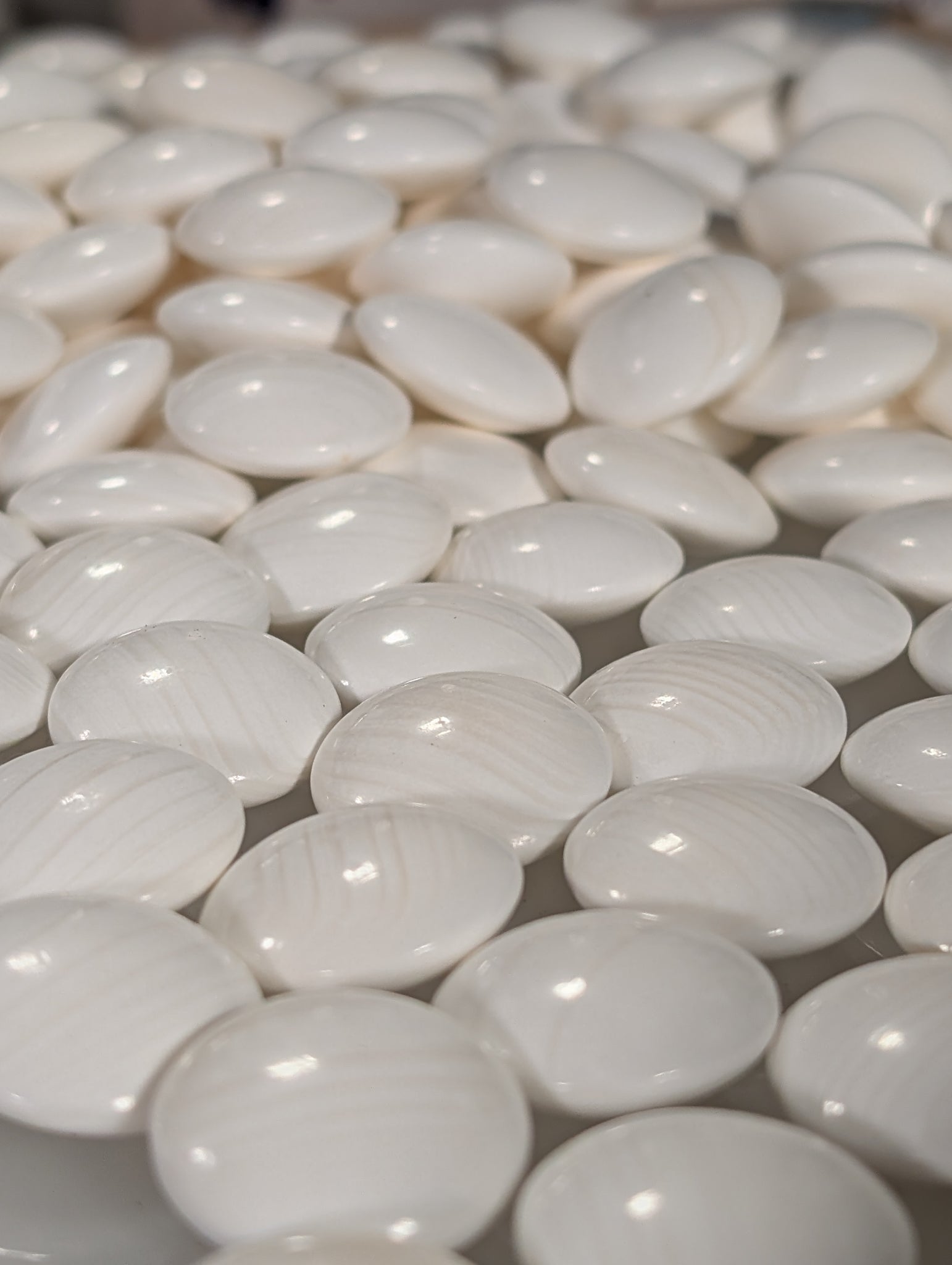 The 180 white pieces are Mexican clamshell. They have a mix of grades but tend strongly towards moon and snow. They were soaked in h2o2, washed, and rinsed with distilled water.
