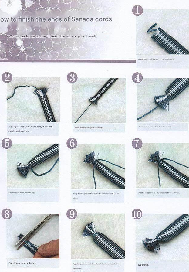 Sanada cord originated when Sanada Yukimura, a warlord of the Sengoku period, used it for his armor. The patterns are created using warp and weft threads in a flat, string-like shape. The firm texture and durability of this cotton are used for sword handles, sword hanging cords, and as tying cords for paulownia wood boxes (in addition to Go Bowls, these boxes also store pottery, tea utensils, and art objects). In modern times these ribbons are also used for mobile phone straps and bag handles, or sewn onto pants, shirt collars, and sandals.