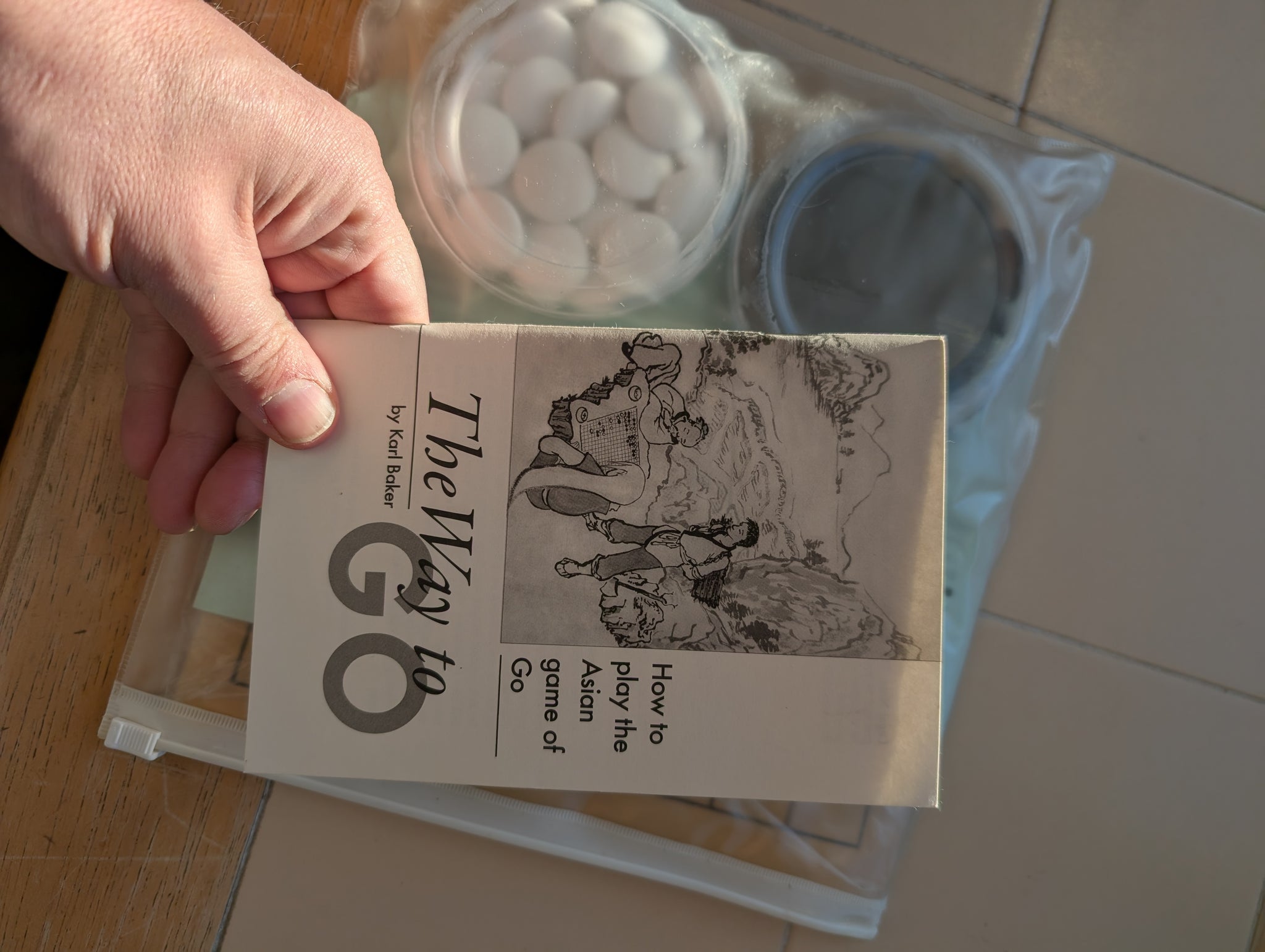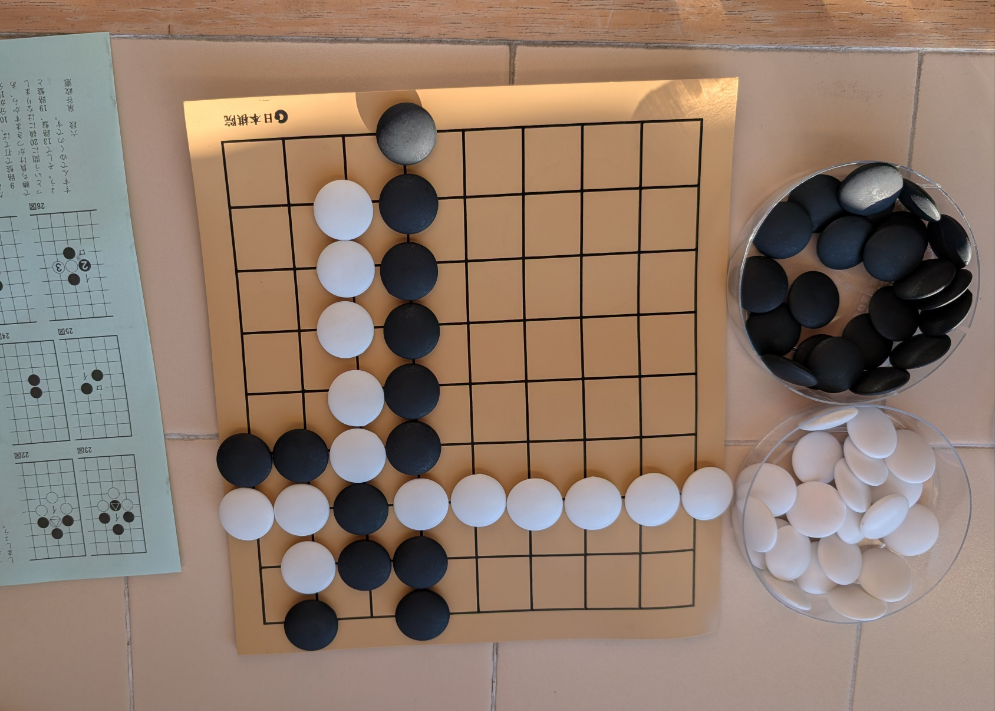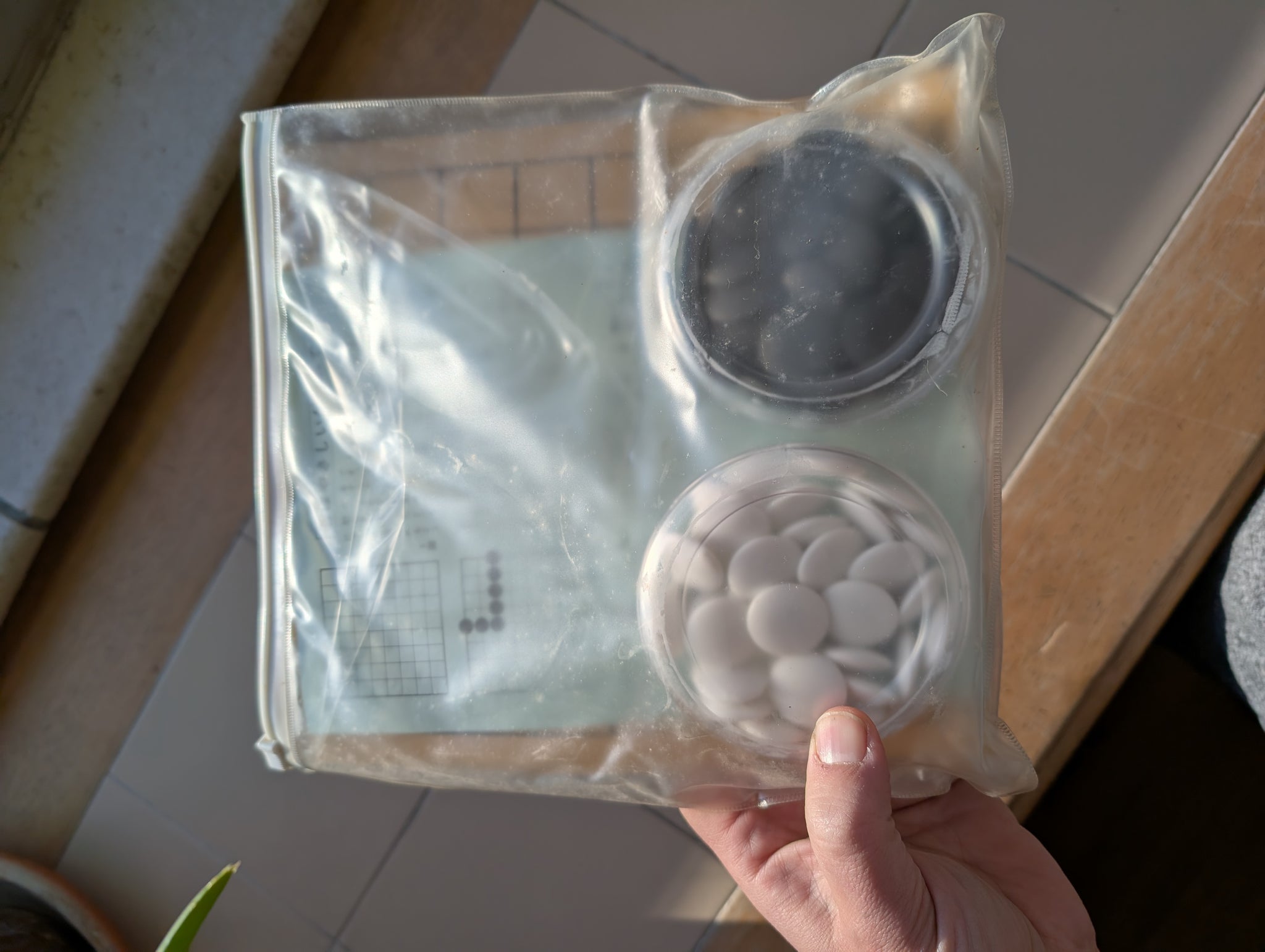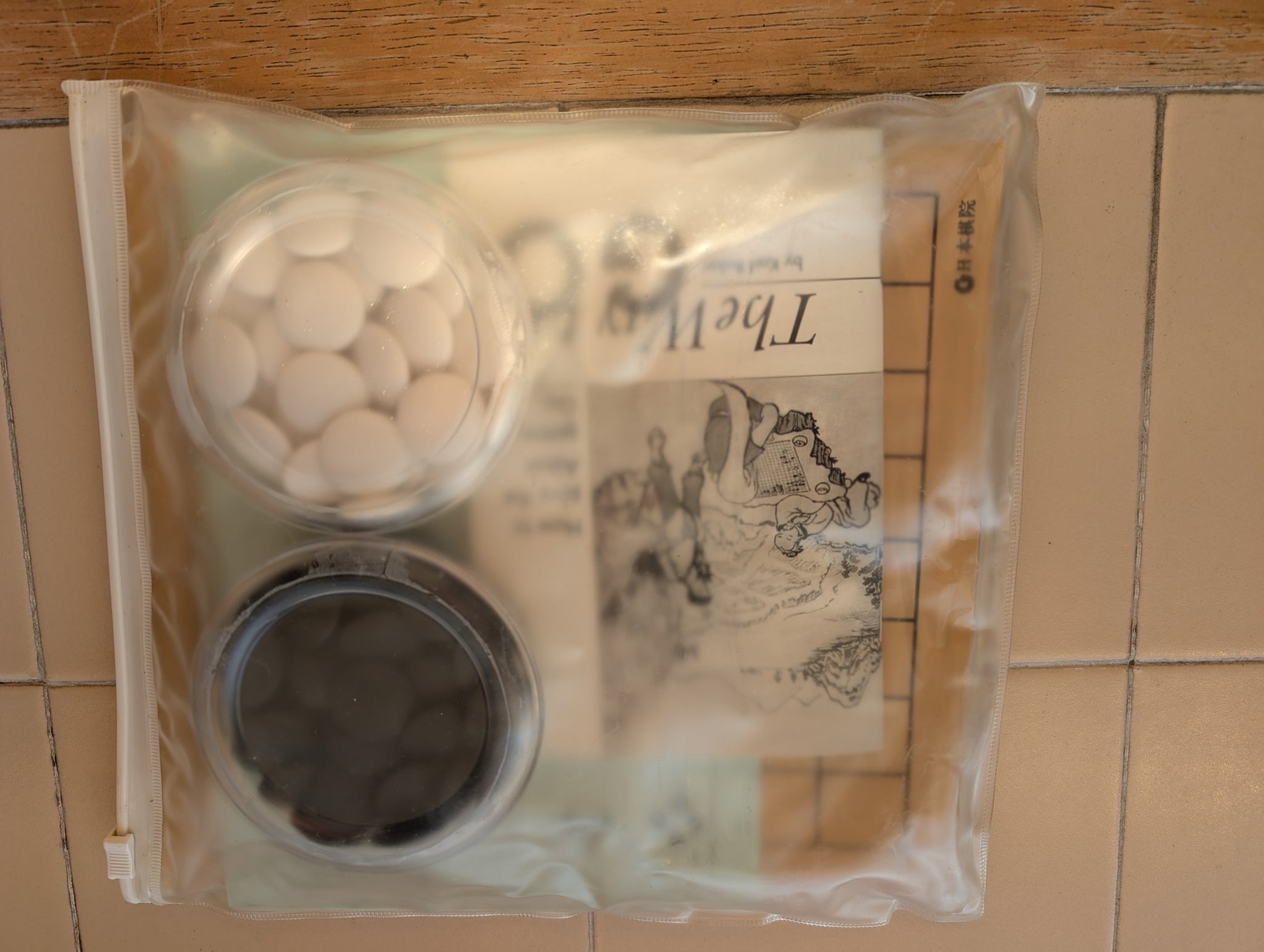 This 9x9 set is everything you need to get started with the Game of Go. Straight from the Nihon-Kiin in Japan, the set it includes a vinyl board, 2 plastic containers with lids, ~35 pieces of each color, and instructions in English and Japanese.