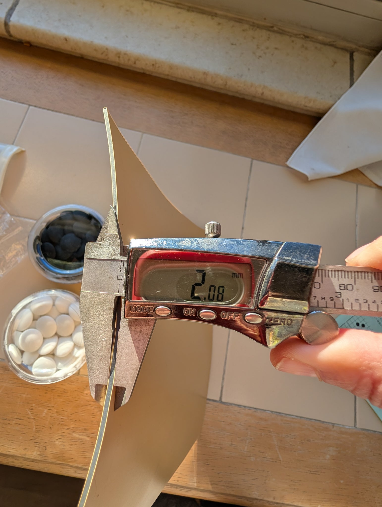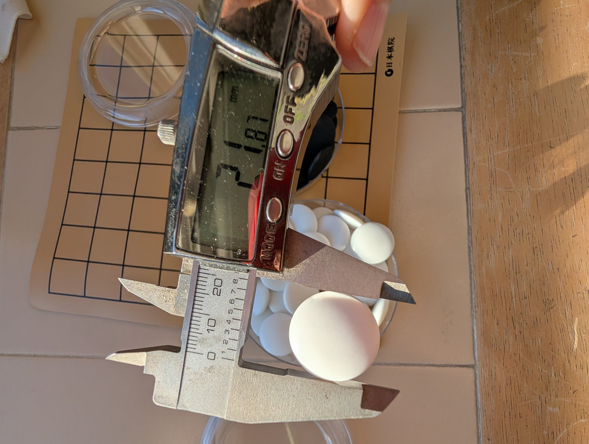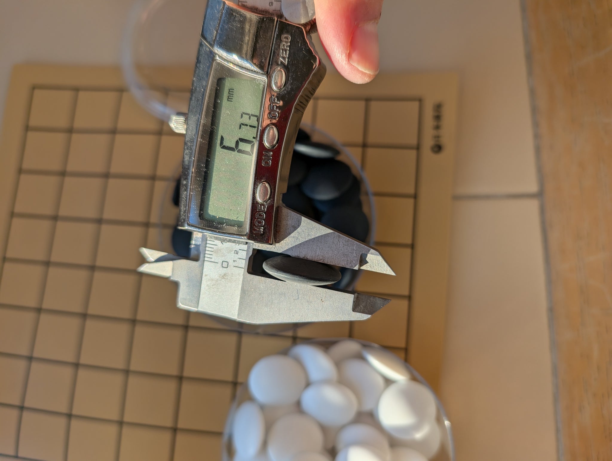 The stones are a lightweight plastic resin. They are the standard size at 22mm wide, and about 7mm thick. The black stones are slightly larger than the white to account for black's slimming effect.