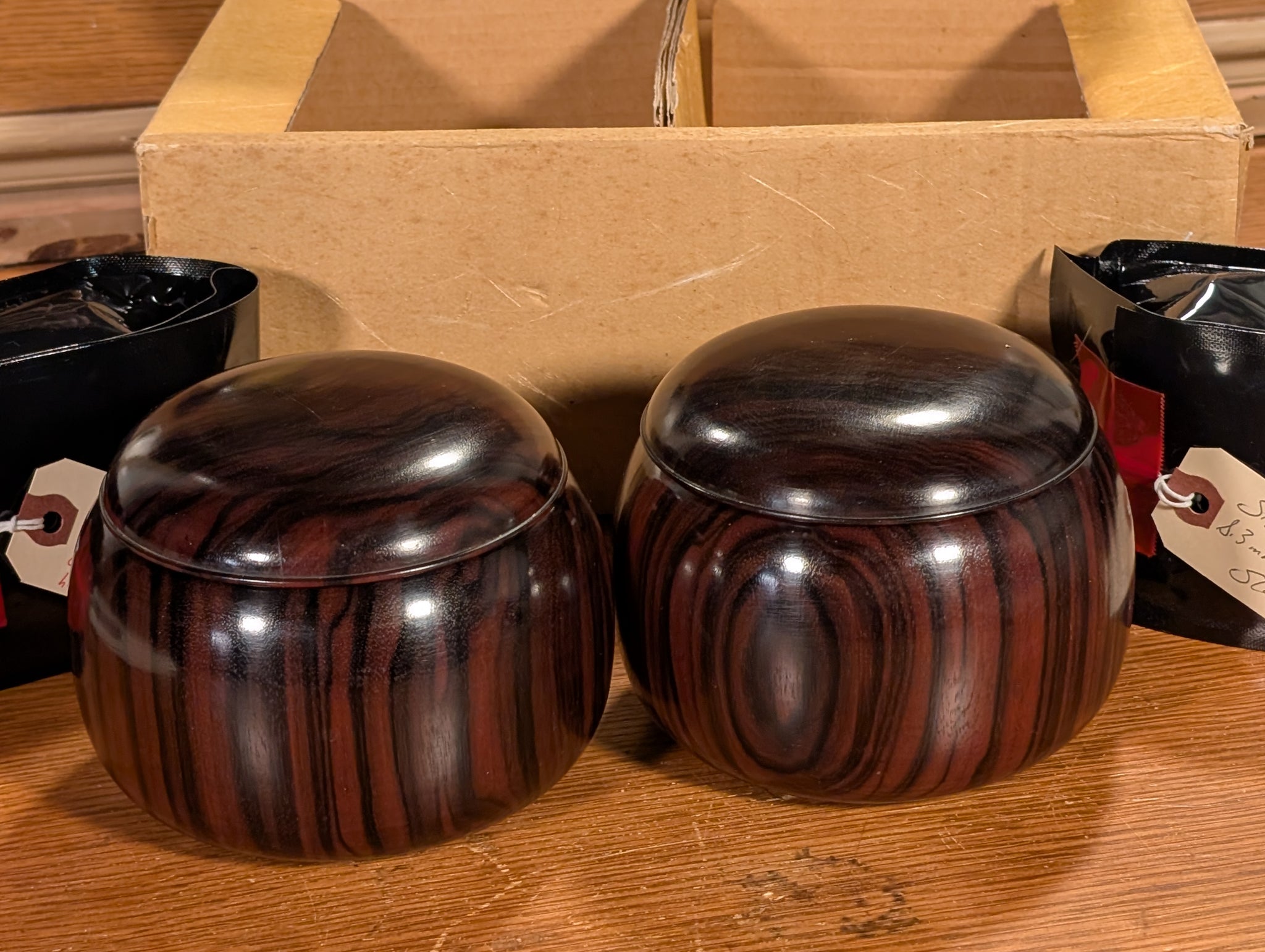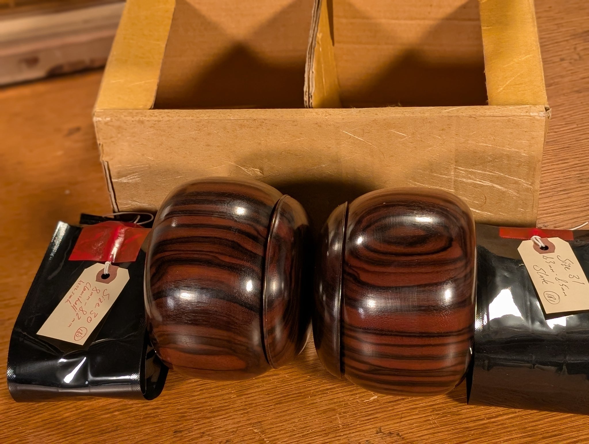 The bowls are Kokutan (ebony), a dense and rare wood in the rosewood family. The bowls were cleaned of their original finished and buffed with a Monkey Butter polish. They feature beautiful black and brown stripes. They were fashioned exquisitely, with perfect punts/kick-ups. To help protect the stones from the hard wood and from potential discoloration, we recommend that you add a small mat or liner inside each bowl.