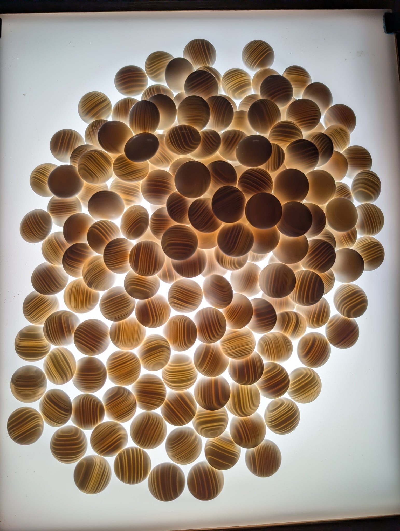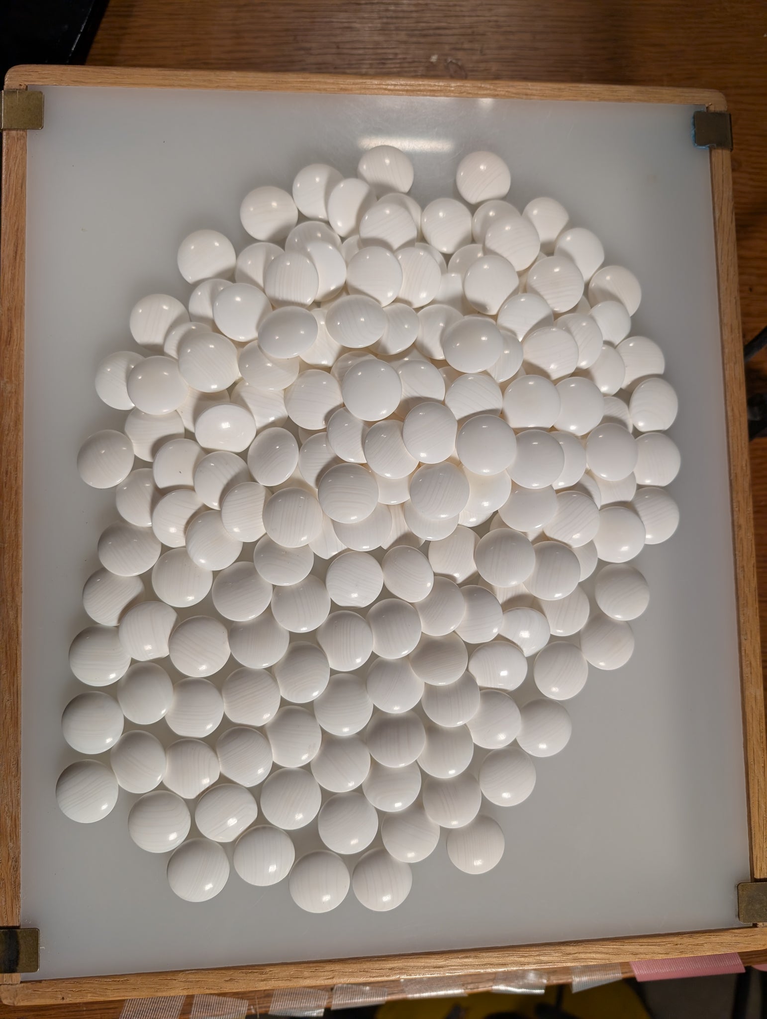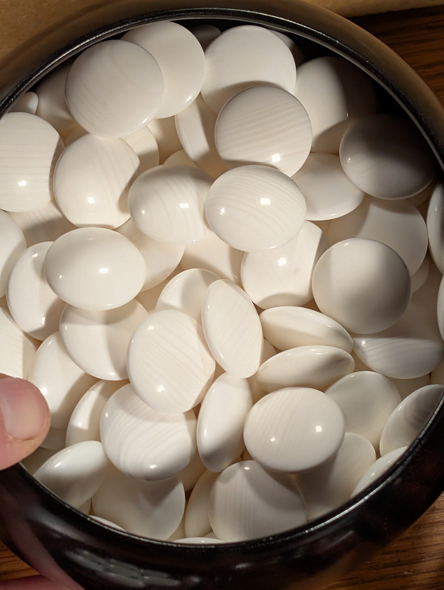 The stones are size 30 slate & shell, about 8mm thick. They have been cleaned per our Care Instructions. As you can see from the photos, the 180 white pieces are Mexican clamshell. The 181 black pieces are slate, slightly larger than the white to account for black's slimming effect.