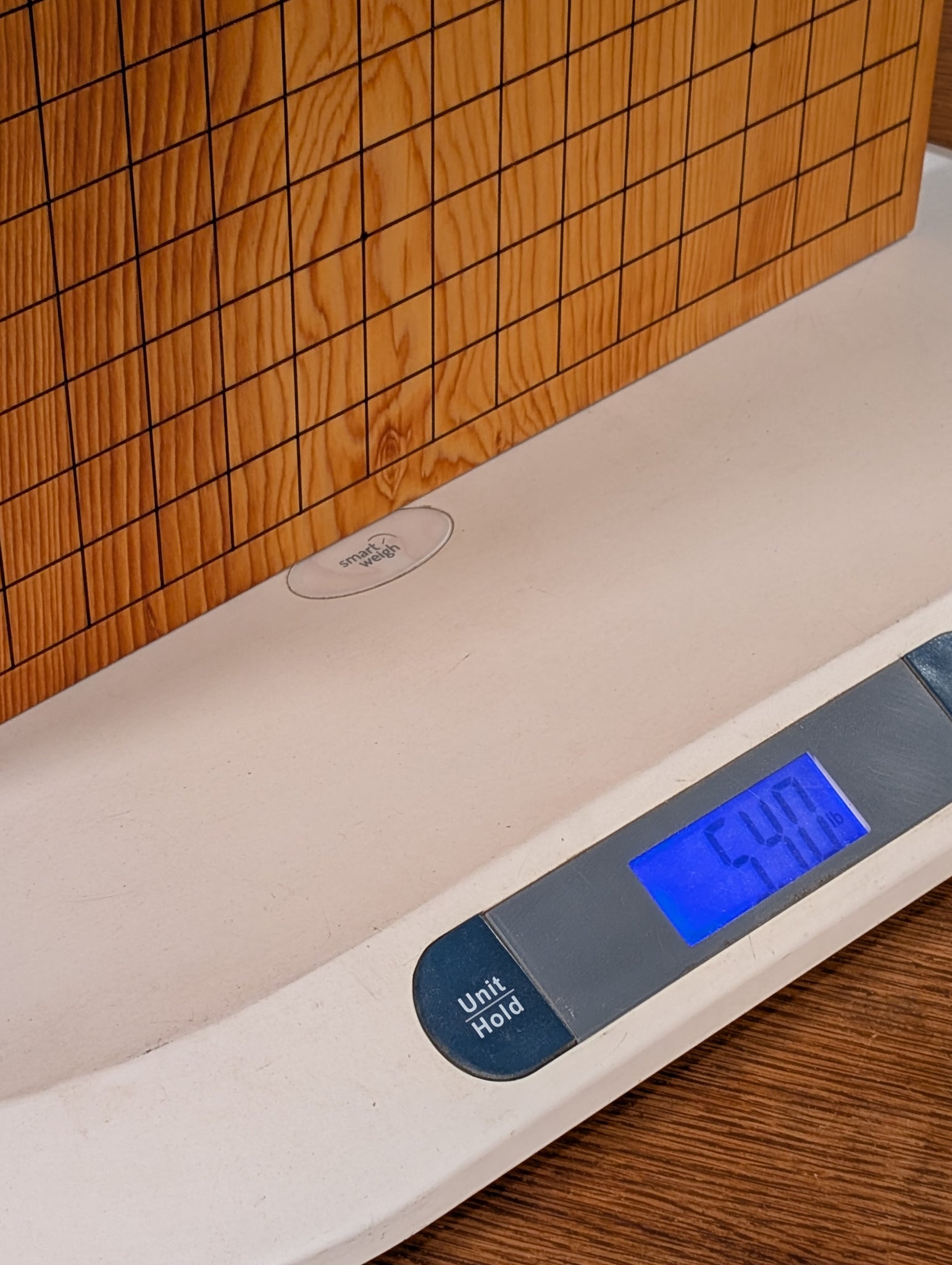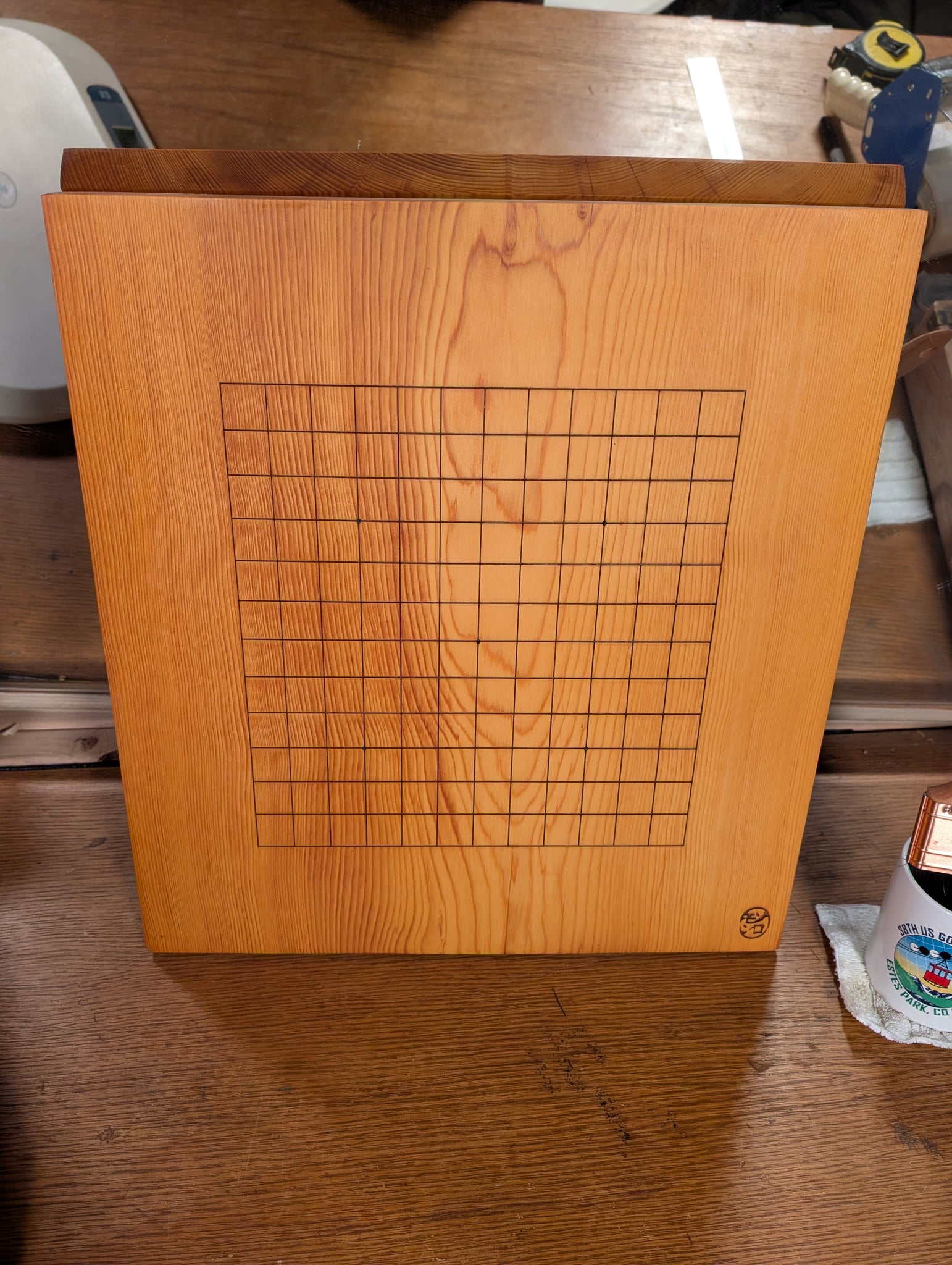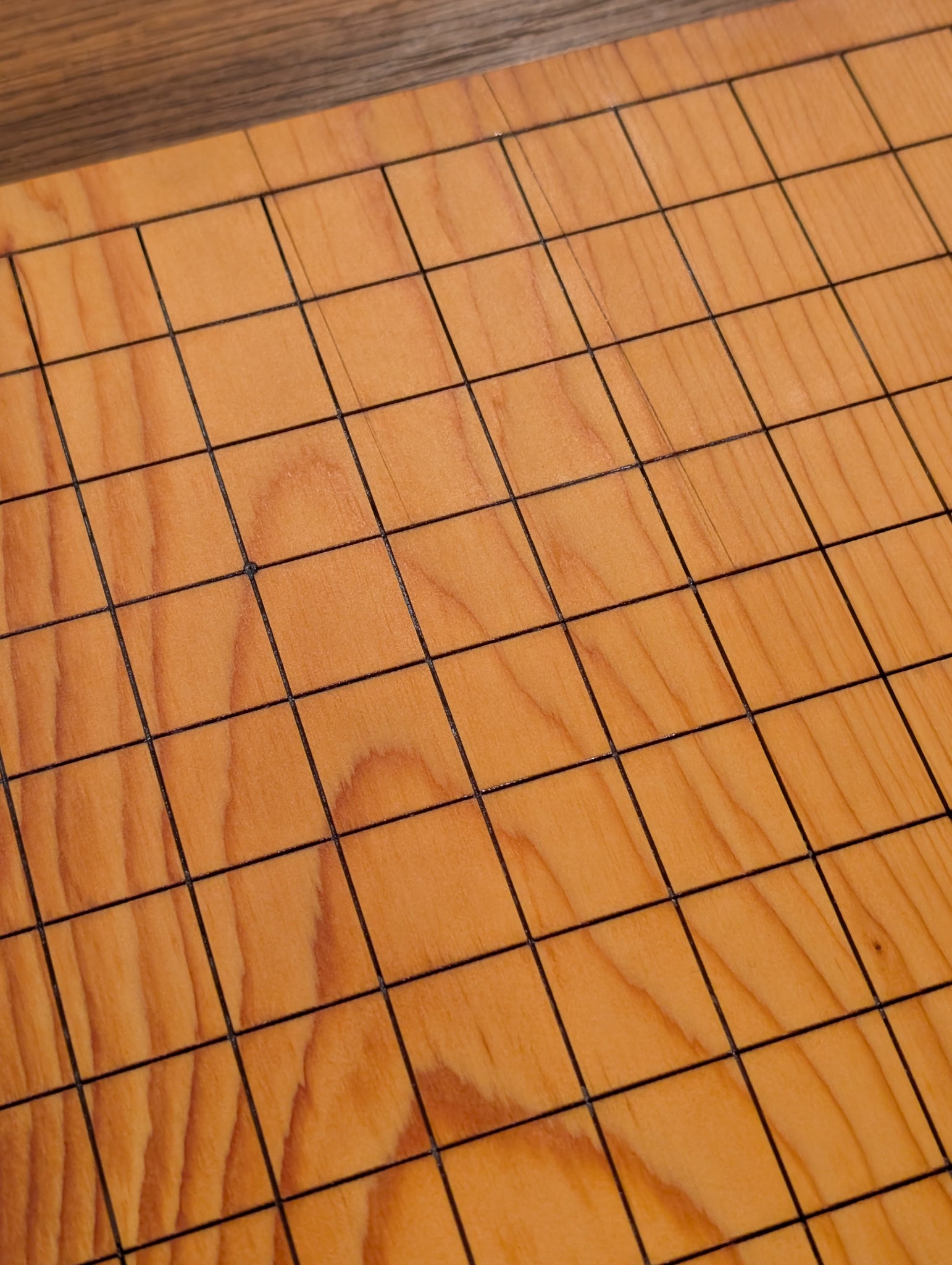 This board was originally part of a floor board that was repurposed as 4 table boards. The wood was planned on all sides, divided with a band saw, and then sanded. Next, a laser was used to engrave a new 19x19 grid on the top and a 13x13 grid on the underside. These grids are based on standard Japanese dimensions, with cells 22mm wide and 23.7mm tall. Finally, the board was treated with mineral oil, dried, then treated with Monkey Butter and buffed clean.