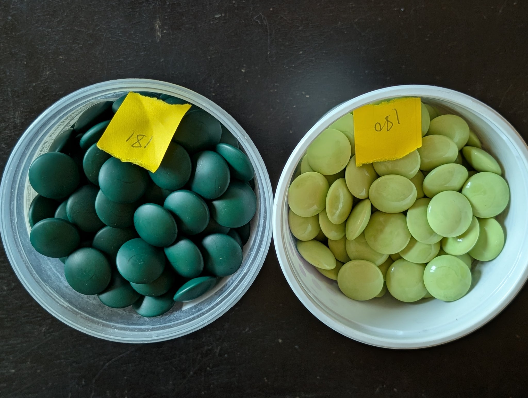 Каждый набор содержит 181 черную и 180 белых деталей. Они стандартного японского размера. Сломанные и отсутствующие камни были заменены. Коричневые футляры от Nihon Kiin хорошо подходят для камней 6 мм-8 мм, вы увидите опцию набора в выпадающем меню.
