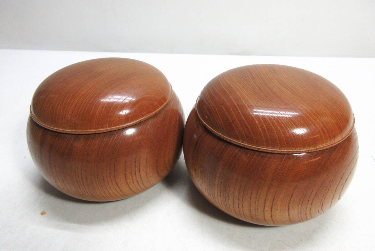 The go bowls are extra large Keyaki (zelkova). Cherry and Keyaki are standard woods for good go bowls, as they are midweight and sturdy. They come with matching lids and they fit the stones comfortably.