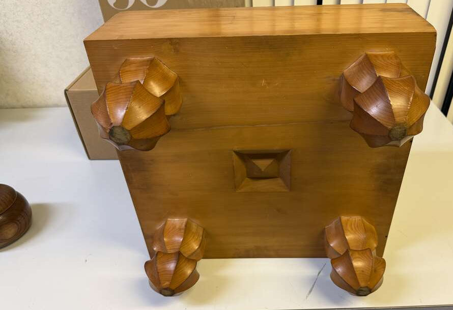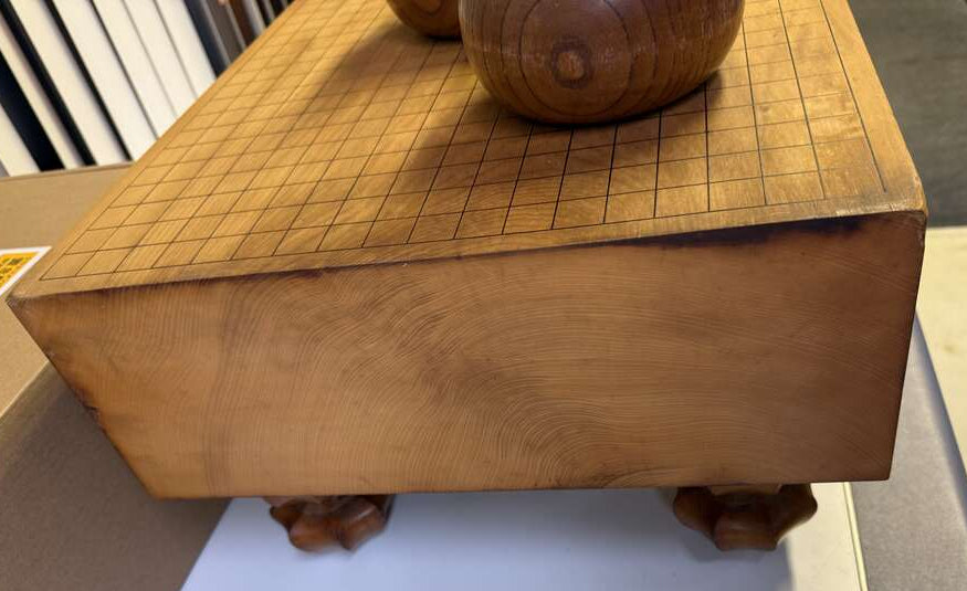 The board is a single-piece of Kaya, cut in the Plain-sawn style (Kiomote). This cutting style shows off the endgrain where you will sit, so you can view the beautiful growth rings. The sides feature some heartwood lines, and the playing surface has a unique ripple pattern like a contour map of mountain ridges. Kaya blocks are cured for 10 years before being shaped into a board, the result is that the board is very stable and very dense. There are incidental marks, which cannot be helped with a used board. We have discounted this set on account of serious defects, such as some cracks in the board and the dented corners.